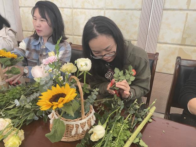 本次活動主要包括兩個部分:先是由講解員為廣大女教職工分享花藝美學知識,大家跟隨講解員的介紹一步一步進行插花,切身體會插花的雅韻;再由講解員分享日常養(yǎng)花護花技巧并一齊拍合照留念。