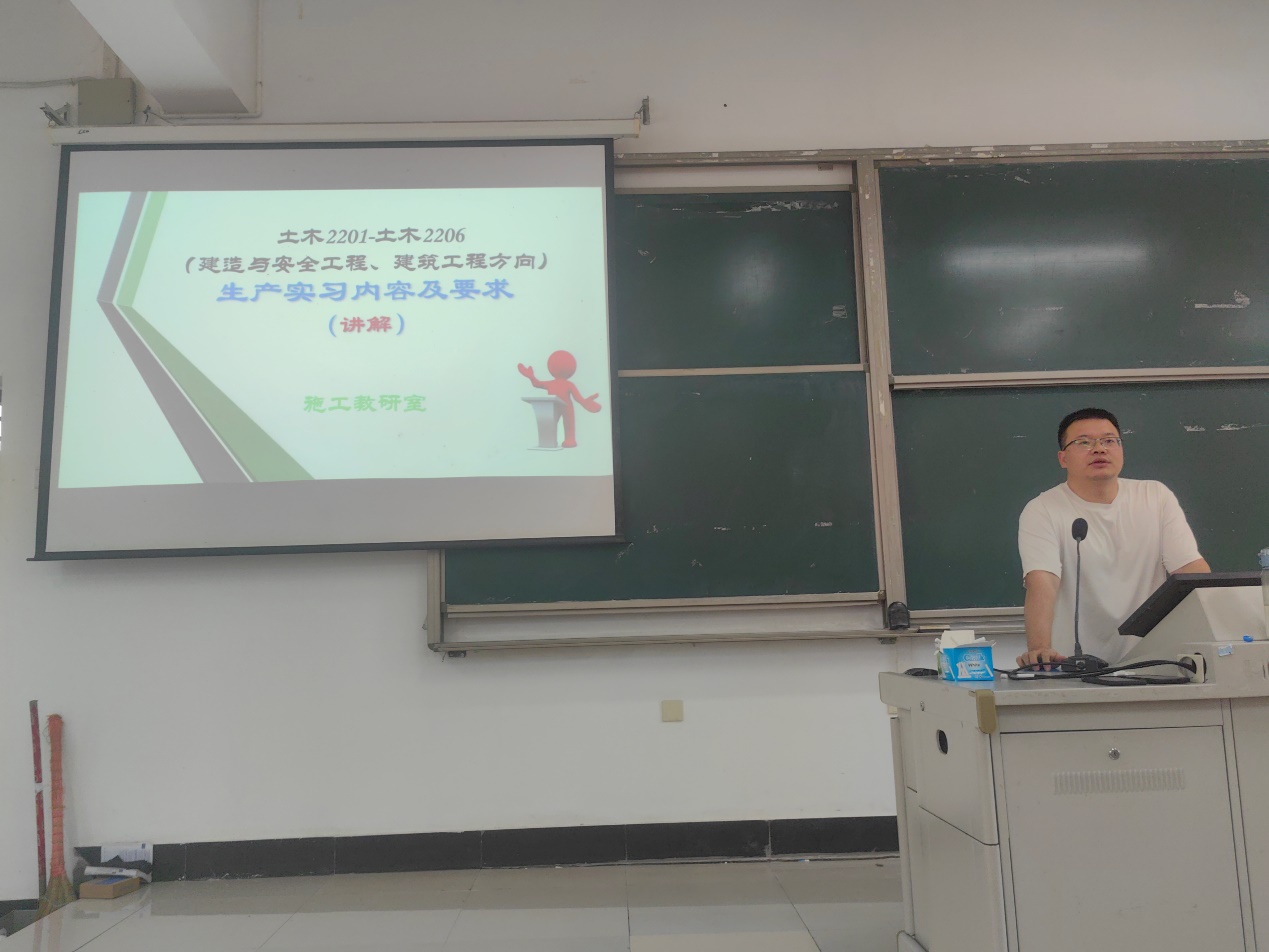 為更好地指導(dǎo)學(xué)生參加專業(yè)生產(chǎn)實(shí)習(xí),6月18日,土木工程學(xué)院于大教西-1召開生產(chǎn)實(shí)習(xí)動(dòng)員會(huì)。施工教研室實(shí)習(xí)指導(dǎo)教師及土木工程學(xué)院2022級(jí)建筑工程方向和建造與安全工程方向全體學(xué)生參加了動(dòng)員會(huì)。