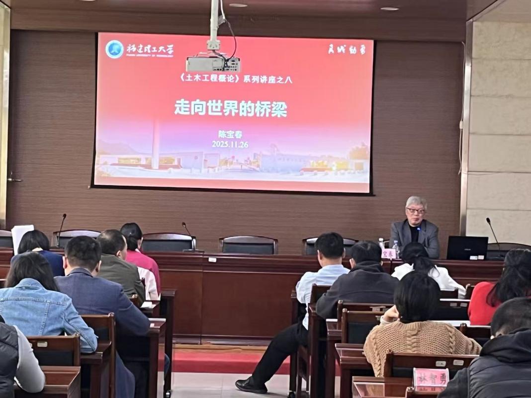 2025年11月26日下午,我院特邀國際知名拱橋專家陳寶春教授在思源樓六樓做主題為《走向世界的橋梁》的學術講座,分享其在國際拱橋領域深耕多年的寶貴經驗與心路歷程。講座由學院副院長莊金平教授主持,學院全體教師參加了此次活動。